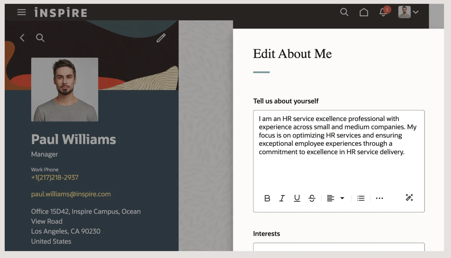 Con el apoyo del servicio de IA generativa de Oracle Cloud Infrastructure (OCI), las nuevas capacidades están integradas en los procesos de RRHH existentes para permitir la obtención más rápida de valor de negocio, para mejorar la productividad, la experiencia de los candidatos y de los empleados, y para agilizar los procesos de RRHH.