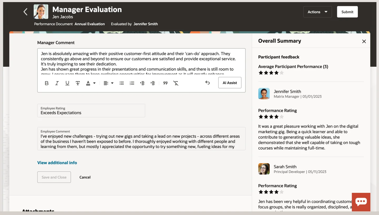 Ayuda a aumentar la eficiencia sacando a relucir las ideas clave de una o más fuentes de datos. Las nuevas capacidades de IA generativa pueden resumir los elementos clave de un contenido para un consumo sencillo e impactante. Por ejemplo, pueden proporcionar un resumen del rendimiento del empleado para su presentación en el ciclo de revisión periódica del mismo, basándose en feedback recogido a lo largo del año de él mismo, de sus compañeros o jefes, y en el progreso y el logro de sus objetivos.
