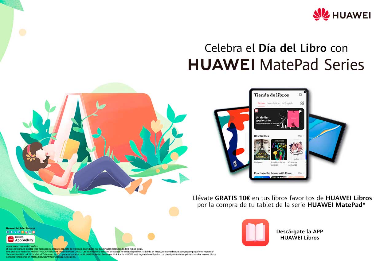 De tal manera, como conmemoración del Día del Libro, este año, Huawei CBG España lleva a cabo dos campañas con el objetivo de incentivar la lectura a sus consumidores: Para empezar, entre el 23 de abril y el 7 de mayo todos los usuarios que adquieran algún dispositivo de la serie HUAWEI MatePad durante este periodo recibirán un cupón de 10€ para gastar en exclusiva en HUAWEI Libros, la aplicación oficial de libros digitales y audiolibros de la compañía.