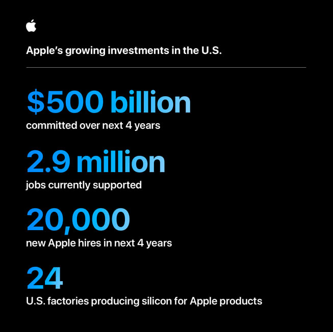 Apple ha anunciado su mayor compromiso de inversión en Estados Unidos hasta la fecha, con un gasto de más de 500.000 millones de dólares en los próximos cuatro años .