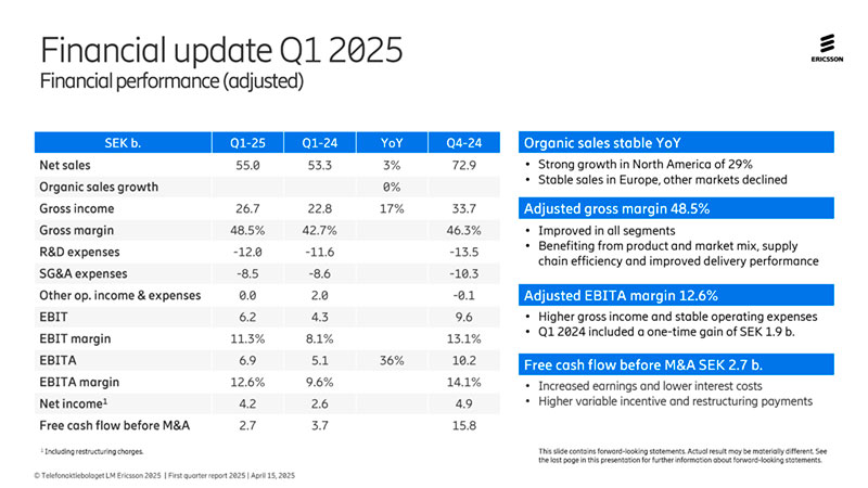 Ericsson cerró el primer trimestre de 2025 con un beneficio neto de 432,6 millones de dólares y un margen bruto ajustado del 48,5 %, consolidando su recuperación operativa en un entorno macroeconómico inestable. Las ventas orgánicas se mantuvieron estables respecto al mismo periodo del año anterior, mientras que el crecimiento se concentró en América del Norte, compensando la evolución desigual en otras regiones.