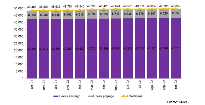Las líneas móviles de voz con banda ancha cerraron el mes de octubre de 2022 con un total de 49,85 millones de líneas, un 2,9% más que en el mismo mes de 2021. Eso supone que el 86,7% de las líneas móviles contaba ya, en esa fecha, con acceso a Internet, según los últimos datos publicados en CNMCData.