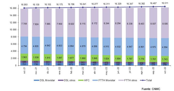 El total de líneas FTTH alcanzó los 13,6 millones, con un crecimiento mensual de 96.809 líneas. El 36,8% del total de líneas FTTH corresponde a Movistar, con un parque de 4,99 millones de líneas. A nivel anual, respecto a octubre de 2021, destaca el aumento de 1 millón de líneas FTTH frente a la pérdida de 0,4 millones de líneas con tecnología DSL.
