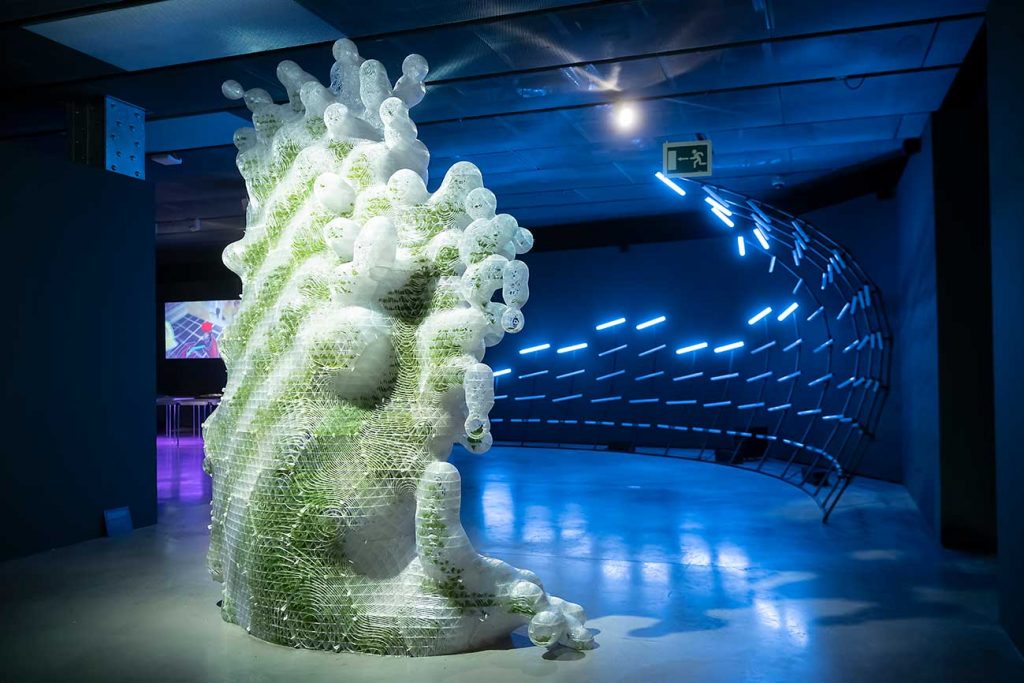 En esta sección encontramos obras como NurturPod 2017 del profesor experto en prospectiva, Stuart Candy, la escultura Hortus XL de ecoLogic Studio, imágenes de The Frozen Neighborhoods de Olalekan Jeyifous o la proyección Seoul City Machine de Liam Young. Una gran escultura tridimensional de visualización de datos creada por Domestic Data Streamers muestra cómo el interés por el concepto futuro varía dependiendo de cada época. Basada en datos de Google Trends, recoge el número de artículos y noticias que incluyen el término “futuro” publicados entre 2008 y 2021.