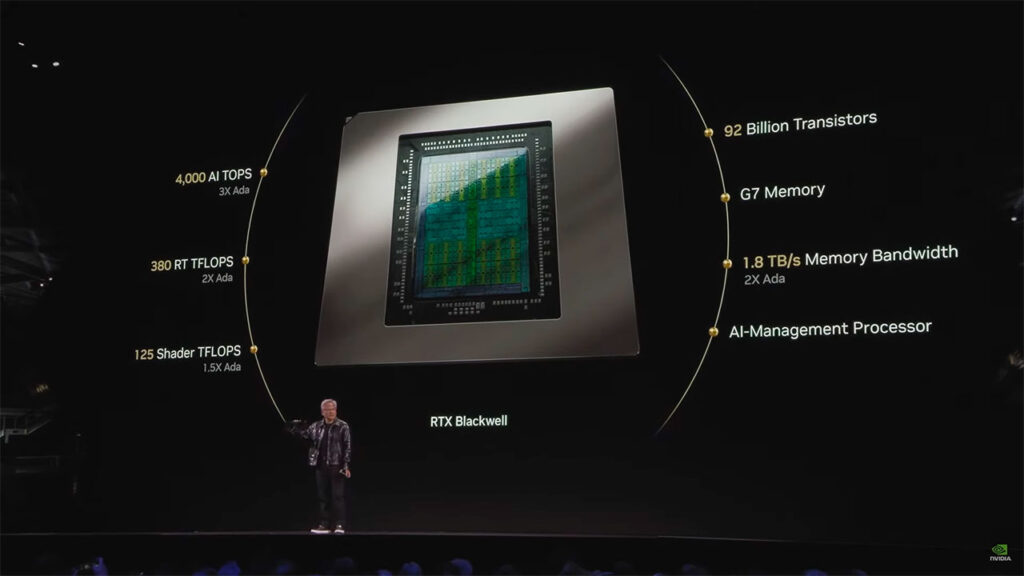 La presentación de los GPUs GeForce RTX 50 Series, liderados por el modelo insignia RTX 5090, fue uno de los momentos más destacados. Huang describió estos procesadores como los más potentes de la historia de NVIDIA, con 92.000 millones de transistores y una capacidad de cálculo de 3.352 billones de operaciones de IA por segundo (TOPS).