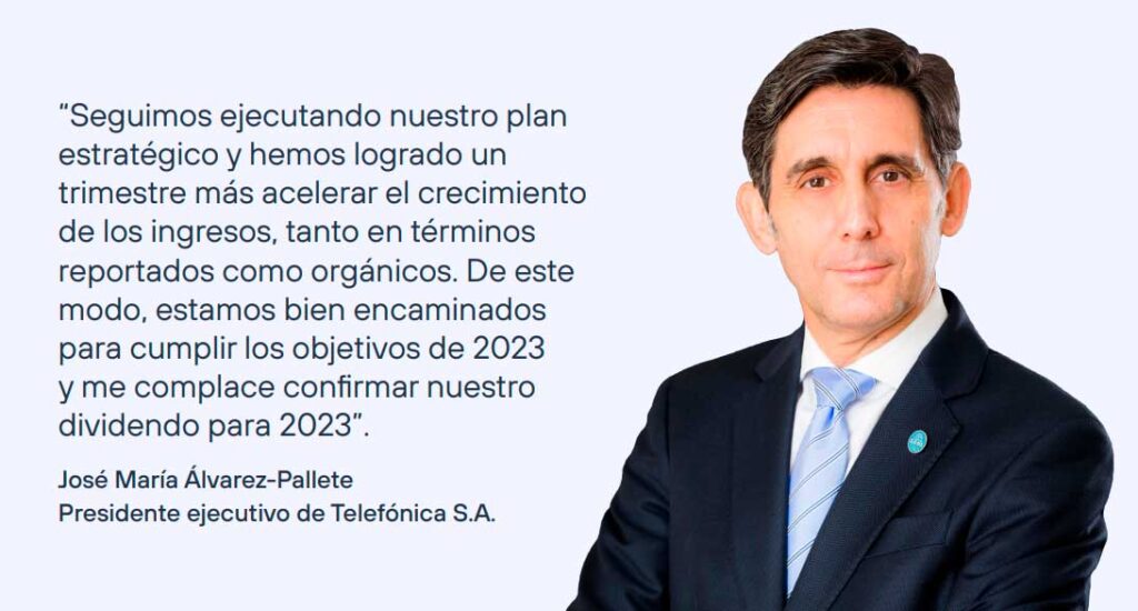 Telefónica ha acelerado su crecimiento en el primer trimestre de 2023 para confirmar la tendencia positiva de sus principales geografías con incrementos generalizados de los ingresos en todos los segmentos y unidades de negocio de la compañía, a pesar de las existentes tensiones inflacionistas.