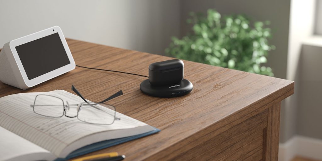 Los Echo Buds pueden cargarse a través de USB-C o de una base de carga inalámbrica Qi compatible, como la nueva Anker PowerWave para Echo Buds fabricada por Amazon (se vende por separado).