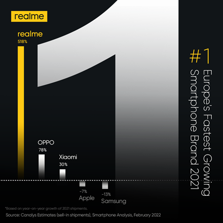 realme se sitúa como la marca que más rápido ha crecido en Europa en 2021. Así lo asegura el último informe de Canalys sobre estimación de envíos, publicado este mes de febrero, donde realme se convierte en la quinta marca que más smartphones vende en 13 países europeos, entre ellos España con un crecimiento anual de un 1008%.