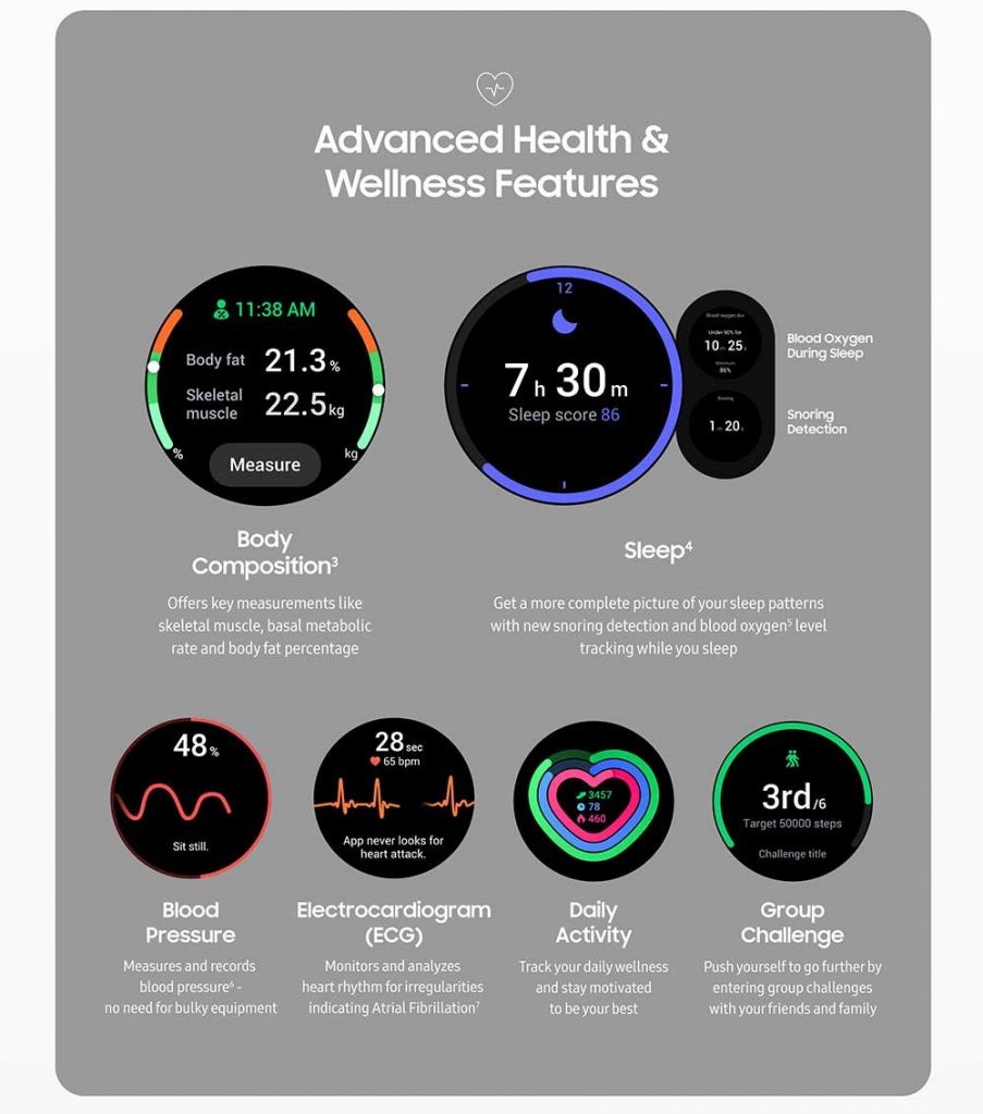 Estos smartwatches incluyen una serie de funciones de bienestar para realizar un seguimiento de las actividades diarias de los usuarios, ayudando a mantenerlo motivado. El usuario puede elegir entre una amplia gama de entrenamientos guiados, disfrutar de los Group Challenges con sus amigos y familiares, o configurar un gimnasio en casa conectando su Galaxy Watch4 a una Samsung Smart TV compatible, donde los recuentos de calorías y las métricas del ritmo cardíaco aparecen en la pantalla para facilitar el seguimiento.