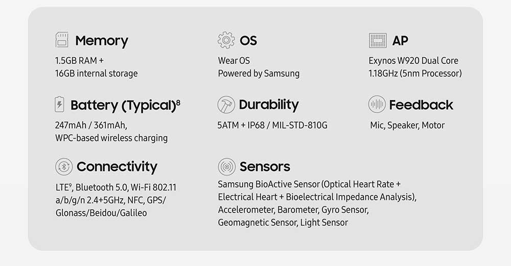 | Sensores | Sensor Samsung BioActive (Sensor óptico de frecuencia cardíaca + análisis eléctrico de frecuencia cardíaca + análisis de impedancia bioeléctrica), acelerómetro, barómetro, sensor giroscópico, sensor geomagnético, sensor de luz | |