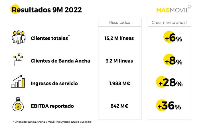 Grupo MASMOVIL anuncia sus resultados correspondientes a los primeros nueve meses de 2022 en los que la Compañía continúa manteniendo su ritmo de crecimiento en todas sus principales magnitudes comerciales y financieras.