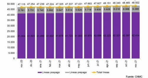 Las líneas móviles de voz con banda ancha cerraron el mes de noviembre de 2021 con un total de 48,5 millones de líneas, un 2,9% más que en el mismo mes de 2020. Eso supone que el 87% de las líneas móviles contaba ya, en esa fecha, con acceso a Internet, según los últimos datos publicados en CNMCData.