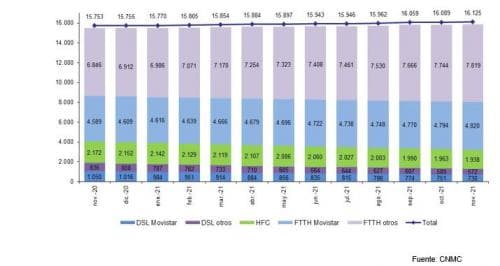 A nivel anual, respecto a noviembre de 2020, destaca el aumento de 1,2 millones de líneas FTTH frente a la pérdida de 0,6 millones de líneas con tecnología DSL.