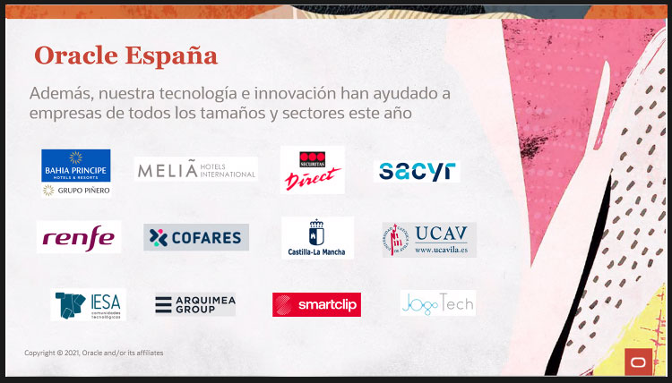 En el caso de los clientes locales de aplicaciones de gestión empresarial en la nube, en el ámbito del ERP en la nube, el directivo ha destacado el proyecto con Food Delivery Brands –Telepizza- y su uso del ERP Cloud de Oracle; COAM, en proceso de modernizar y transformar sus procesos operativos con ERP Cloud; Zurich Seguros y la transformación de su planificación financiera y de reporting con EPM Cloud; Seguros RGA, que avanza en la transformación tecnológica de su área financiera con ERP & EPM Cloud; Crédito y Caución, que va a migrar su sistema de gestión al ERP Cloud de Oracle; o MrJeFF, Bipi Mobility y Signaturit, que están utilizando Netsuite ERP para aumentar su eficacia operativa.