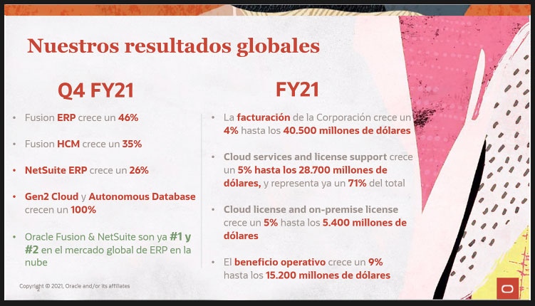Todo ello ha permitido que, por primera vez, Oracle haya superado a nivel mundial en el ejercicio de 2021 los 40.0000 millones de dólares de facturación, con un crecimiento de algo más del 4%. El 71% corresponde a servicios cloud y licencias de soporte, que con un incremento del 5% alcanzan los 28.700 millones de dólares. Además, las licencias cloud y on-premise experimentaron un crecimiento del 5% con 5.400 millones de facturación, mientras que los ingresos de explotación alcanzaron los 15.200 millones de dólares.
