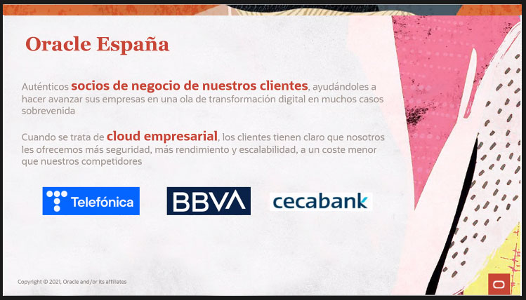 Albert Triola ha afirmado que “cuando se trata de infraestructura cloud empresarial, las empresas tienen claro que nosotros les ofrecemos más seguridad, rendimiento y escalabilidad, y todo ello a un coste menor que nuestros competidores”, destacando algunos de los proyectos más innovadores y transformadores que han llevado a cabo en el último año fiscal en España: Telefónica de España, que ha elegido la nube híbrida y la nube pública de Oracle -Oracle Exadata Cloud@Customer y Oracle Cloud Infrastructure- para su proyecto de actualización del entorno que soporta aplicaciones críticas como CRM o facturación, entre otras; CecaBank, que ha confiado en la seguridad de la nube híbrida de Oracle Exadata Cloud@Customer para sus bases de datos críticas; o BBVA y su Proyecto BELA, que ha elevado un 200% la eficacia de las campañas con clientes gracias a la Inteligencia Artificial y la Analítica cloud de Oracle.