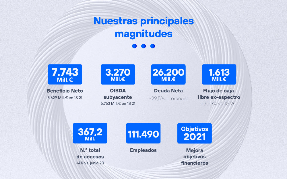 En la primera mitad de 2021 Telefónica ha seguido atrayendo y reteniendo clientes de alto valor. Al cierre de junio, el Grupo contaba con 367,2 millones de accesos, incluyendo el 100% de los accesos de VMED O2, un 3,7% más que un año antes. La red de alta velocidad (fibra y cable) de la compañía ha alcanzado 154,7 millones de unidades inmobiliarias (UUII), un 6% más, de los que 80 millones de UUII corresponden a la propia red del Grupo, un 10% más que un año antes.