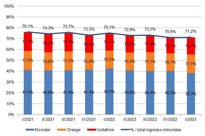 En lo que respecta a los ingresos del sector, se observa una estabilización. Los servicios minoristas generaron ingresos de 5.720 millones de euros durante el primer trimestre de 2023, lo que supone un ligero incremento del 0,1 % en comparación con el mismo período del año anterior. De esta cifra, las tres grandes empresas de telecomunicaciones – Movistar, Orange y Vodafone – acapararon el 71,2 %, aunque se aprecia una reducción de 3,9 puntos porcentuales respecto al año anterior.