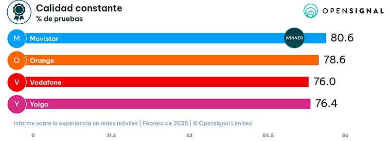 El análisis de Opensignal resalta que Orange y Movistar encabezan la métrica de Disponibilidad, que mide el porcentaje de tiempo en que los usuarios tienen acceso a una conexión de 3G o superior. Ambos operadores presentan una puntuación del 98,9%, lo que les otorga una ventaja de aproximadamente un punto sobre Vodafone y Yoigo, cuyas cifras se encuentran estadísticamente empatadas entre el 97,9% y 98%.