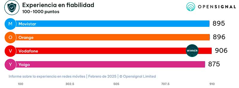 El informe destaca a Vodafone como el operador con la mejor Experiencia de Fiabilidad, un indicador que mide la capacidad de los usuarios para conectarse y completar tareas básicas sin interrupciones. Con una puntuación de 906 en una escala de 100-1000, Vodafone supera en aproximadamente 10 puntos a Orange y Movistar, cuyos resultados de 895-896 los sitúan en un empate estadístico en la segunda posición.