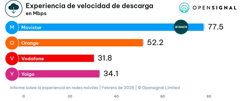 Movistar se reafirma como el operador con las velocidades promedio más altas en España, conservando los cuatro premios de velocidad que obtuvo en el informe anterior: Experiencia de Velocidad de Descarga, Experiencia de Velocidad de Subida, Velocidad de Descarga 5G y Velocidad de Subida 5G. Su liderazgo en descarga se ha ampliado significativamente, con un aumento de 32 Mbps en su puntuación de experiencia.