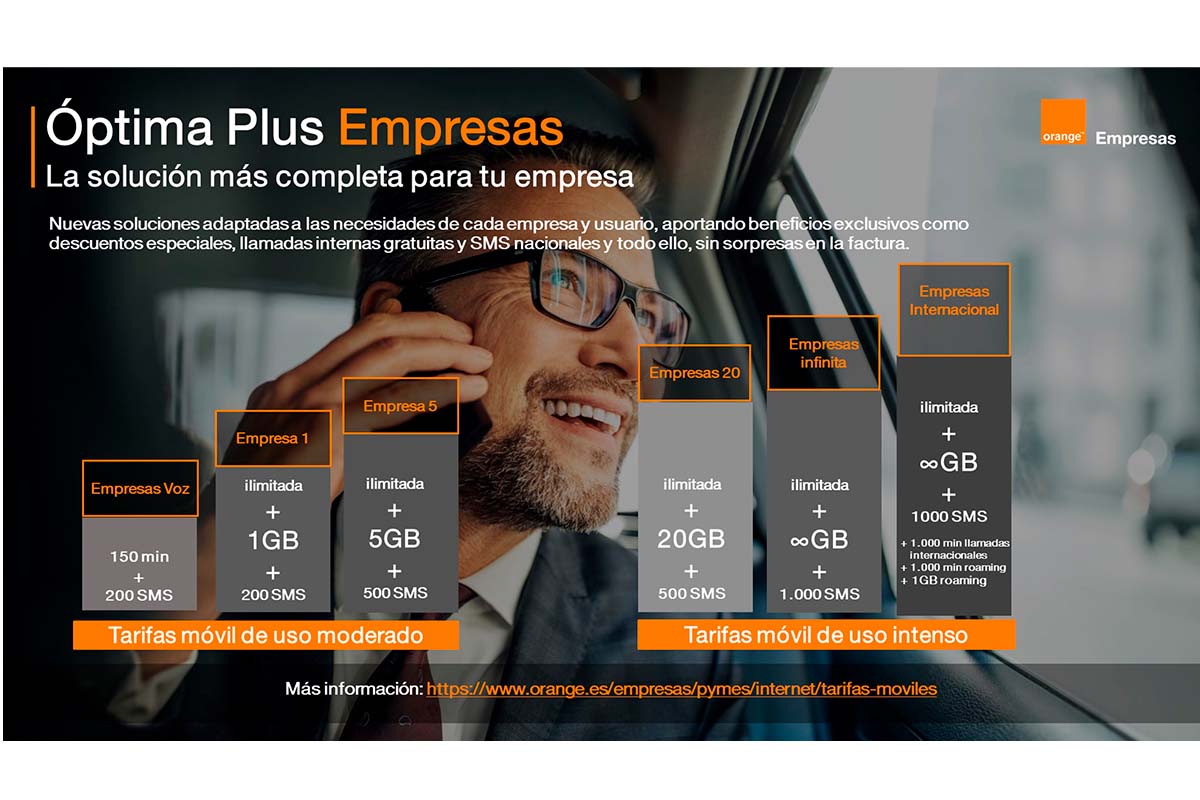 Orange lanza un nuevo porfolio de tarifas , Óptima Plus Empresas, con mayor abundancia de voz y datos, adaptable y flexible, que responde a la necesidad de los usuarios de empresas de 10 o más empleados de disponer de un mayor control en sus tarifas móviles, contemplando desde quienes hacen un uso moderado hasta los que requieren más abundancia en voz y datos.