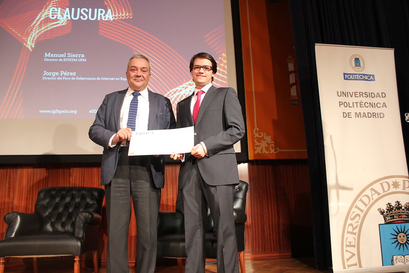 En las últimas semanas, Ridruejo había presentado y defendido públicamente un ensayo sobre normalización, estandarización y regulación de las tecnologías disruptivas. El jurado, compuesto por representantes de IGF Spain y de DigitalES -Asociación Española para la Digitalización-, ha valorado la calidad de su ensayo y la coherencia en la defensa de sus principales argumentos. Ridruejo ha recibido el reconocimiento de manos de Víctor Calvo-Sotelo, director general de DigitalES. El premio consiste en una beca para asistir al foro paneuropeo EuroDIG en Tampere (Finlandia), el próximo junio.