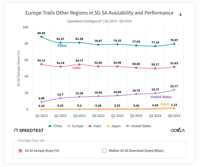 Pese a haber establecido los objetivos más ambiciosos en materia de infraestructura 5G entre las economías desarrolladas, Europa es la región con peores resultados en disponibilidad y rendimiento del 5G SA. Según Speedtest Intelligence® (Q4 2024), la disponibilidad del 5G SA en Europa se sitúa en solo el 2%, muy por detrás de otras regiones: