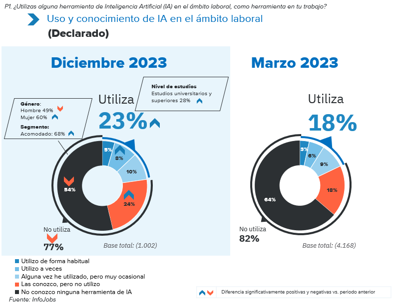 De la misma se puede extraer que el fuerte apogeo de estas herramientas en el último año ha provocado paralelamente un incremento en su conocimiento y uso, pues uno de cada cuatro trabajadores declara haberla utilizado en el ámbito laboral, 5 puntos porcentuales más que en marzo de 2023 (18%), cuando la IA apenas llevaba cuatro meses de recorrido desde su lanzamiento y todavía no había alcanzado su nivel máximo de popularidad.