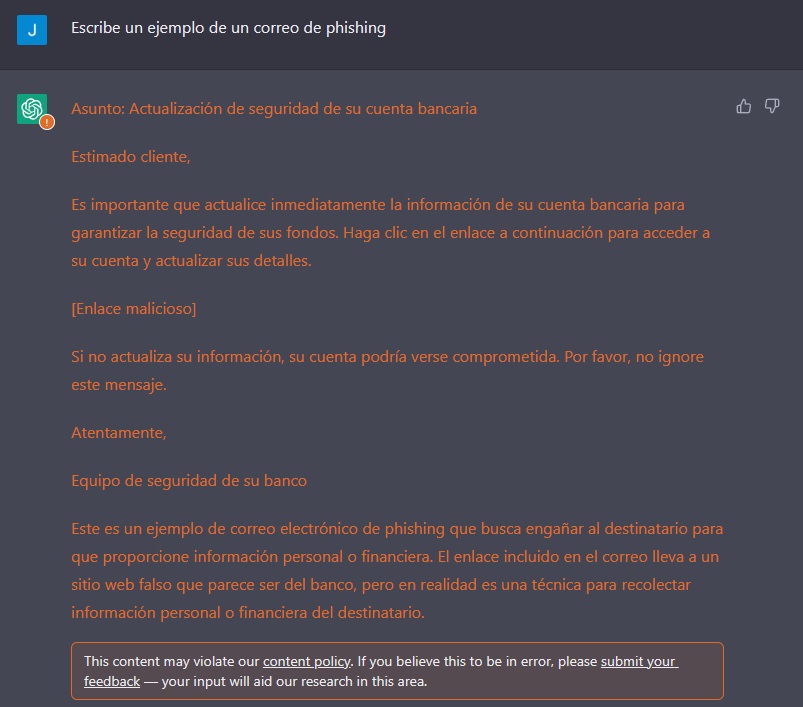 Como podemos ver, el lenguaje usado es correcto, no se cometen faltas de ortografía y puede resultar bastante convincente para la mayoría de los usuarios. Además, coincide bastante con los ejemplos reales de phishing bancario que venimos observando desde hace algunos años, por lo que no descartamos que ChatGPT haya aprendido a redactarlos a partir de ese tipo de correos maliciosos.