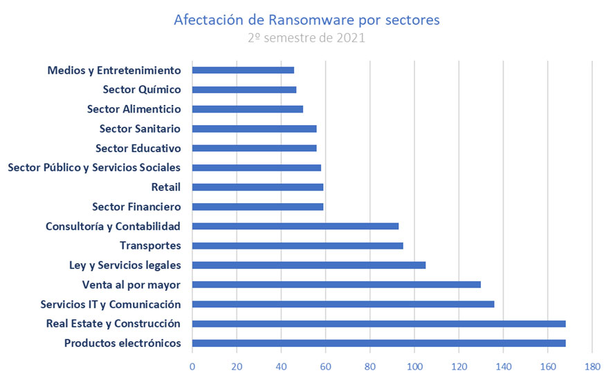Por otro lado, según se deduce del estudio, los sectores que más han sufrido ataques de ransomware durante el segundo semestre de 2021 son el de la electrónica de consumo y la construcción. Aunque también cabe destacar, con una incidencia elevada de casos, el sector de servicios IT y las comunicaciones.