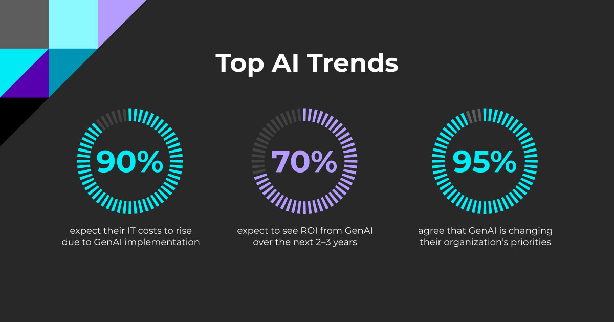 El 90% de los encuestados prevé un incremento en los costes de TI derivado de la implementación de soluciones GenAI. No obstante, el 70% confía en que la inversión será rentable en un periodo de dos a tres años. Este optimismo responde a los beneficios esperados en términos de productividad, automatización y eficiencia operativa.