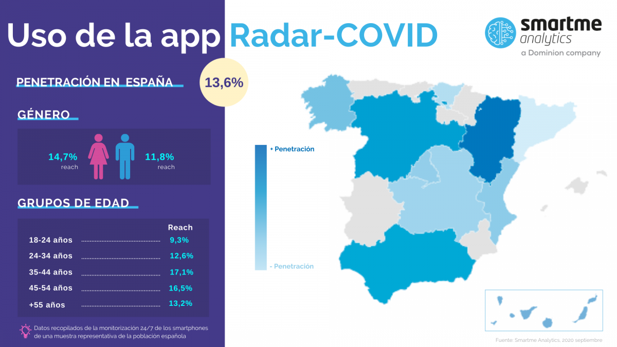 El uso de la aplicación Radar COVID creció un 103% en el último mes -desde el 15 de agosto al 15 septiembre- y se utiliza ya por el 13,6% de la población española, según un estudio realizado por la consultora pionera en el uso de la Tecnología Observacional Smartme Analytics, que permite ofrecer un reflejo preciso del uso real de los servicios digitales.