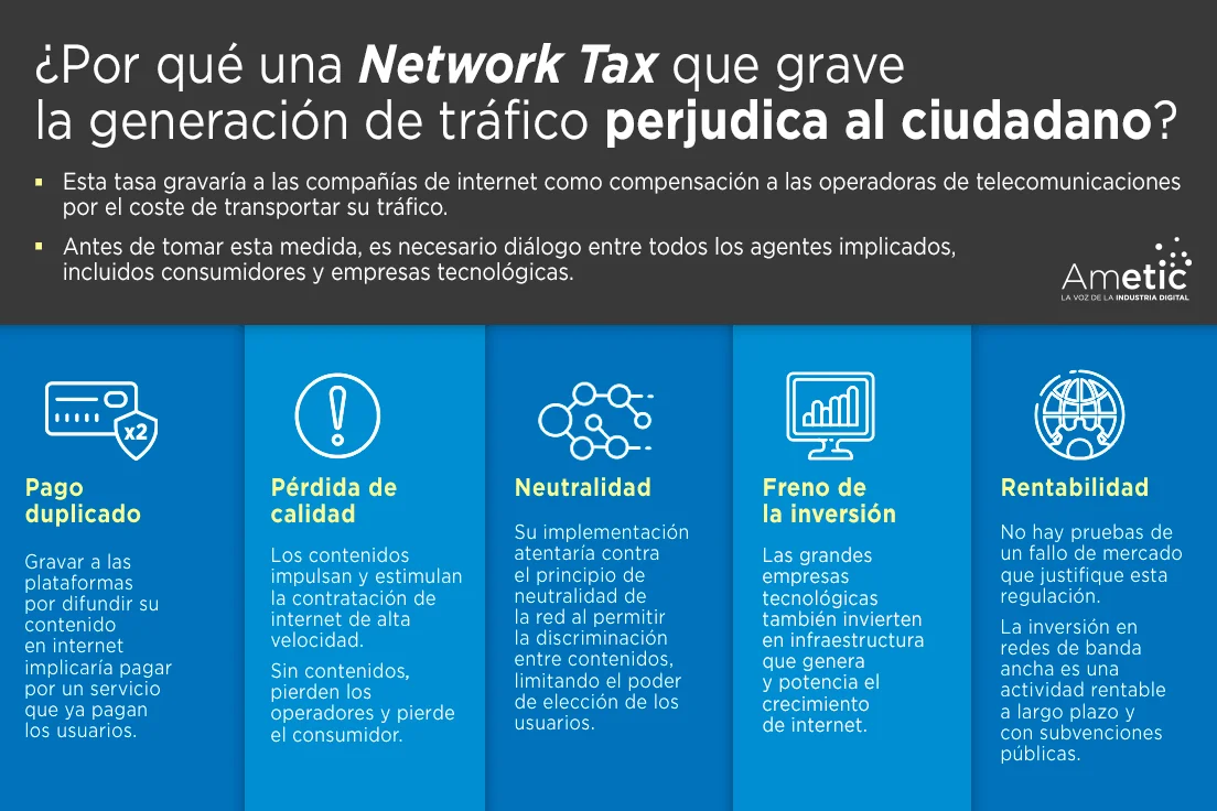 AMETIC considera necesario un amplio debate sobre la implementación de una Network Tax , una tasa que grave a las empresas que basan su actividad en internet como compensación a las operadoras de telecomunicaciones por el coste de transportar su tráfico, por el impacto que podría tener en los ciudadanos, empresas y el funcionamiento de Internet.