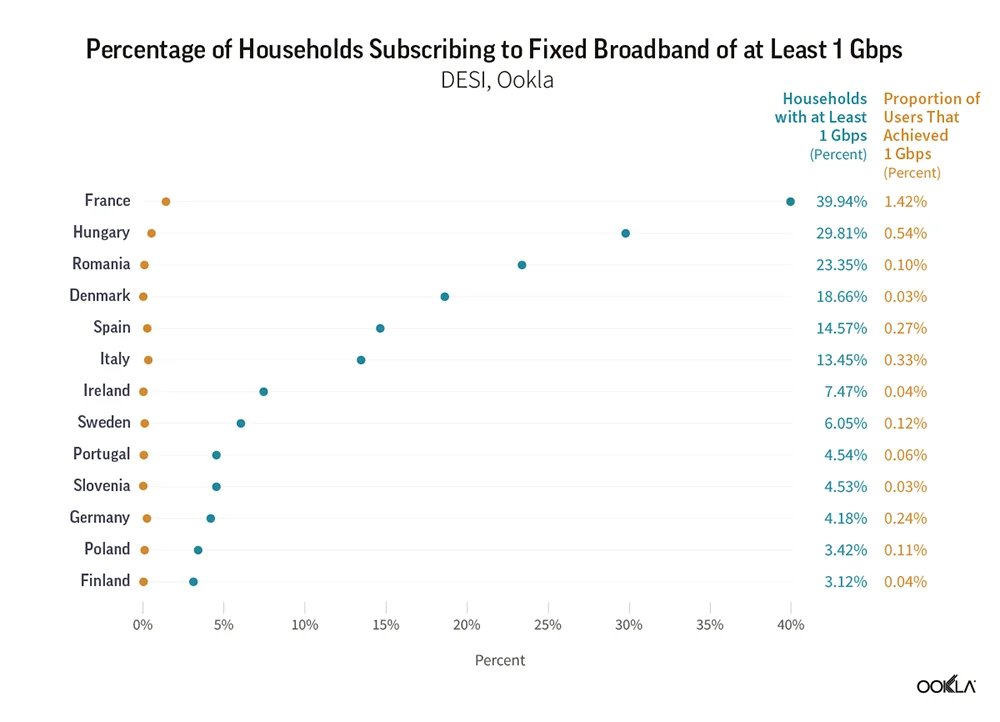 Según el panel DESI 2023 para la Década Digital, el 13,76% de los hogares en la Unión Europea se había suscrito a banda ancha fija con al menos 1 Gbps a partir de 2022. Sin embargo, hay una disparidad significativa en estos porcentajes entre diferentes naciones de la UE. Por ejemplo, solo cinco países superaron el valor de la UE: Francia lider