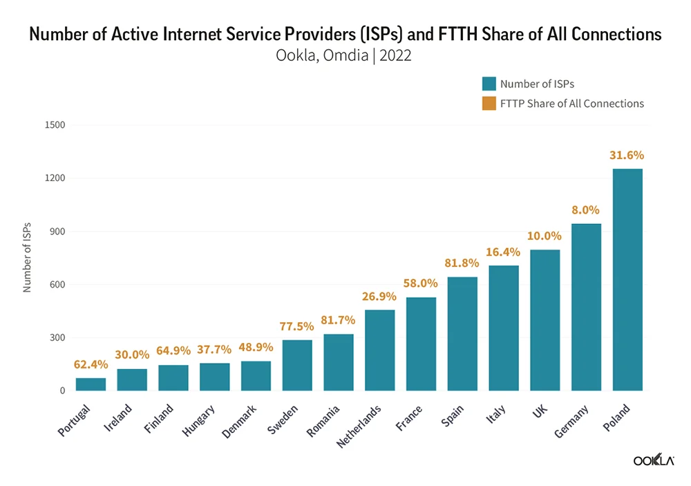 - Participación en Proyectos de Infraestructura: En países como el Reino Unido y Polonia, que cuentan con un alto número de ISPs, los AltNets están liderando iniciativas impulsadas por la fibra. En el Reino Unido, por ejemplo, se concluyó que los AltNets proporcionaron las velocidades más altas en ciudades principales como Londres, Glasgow, Liverpool y Manchester, así como en diversos condados. El financiamiento público ha sido esencial para el surgimiento de ISPs de fibra en áreas rurales donde el despliegue de fibra no es comercialmente viable.