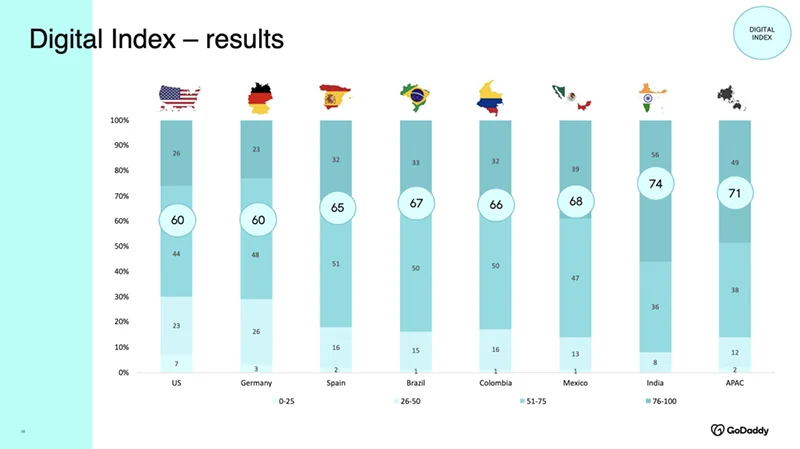 Finalmente, el Digital Index presentado por GoDaddy ofrece una medida cuantitativa del estado de digitalización de las empresas. España, con una puntuación de 65, supera a países como Estados Unidos y Alemania, aunque todavía queda por detrás de líderes en digitalización como India.