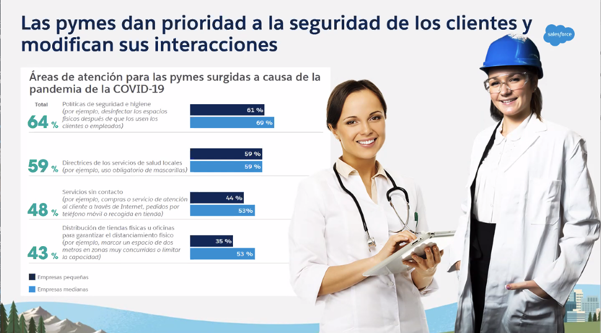 La pandemia de COVID-19 ha afectado a empresas de todos los sectores, tamaños y regiones y ha hecho que cambien sus prioridades de forma radical. Así, para el 64%, las políticas de sanidad e higiene son ahora un área de atención, seguida de los mandatos de las autoridades sanitarias locales (59%), la oferta de servicios sin contacto (48%) o garantizar la distancia social en establecimientos físicos (43%). Sin embargo, la experiencia de cliente sigue siendo primordial, por lo que las pymes han modificado sus interacciones con los consumidores, por ejemplo, siendo más cuidadosos en las comunicaciones (55%), ampliando los canales de comunicación (47%), ofreciendo una mayor flexibilidad (44%) o priorizando el desarrollo de las relaciones (34%).