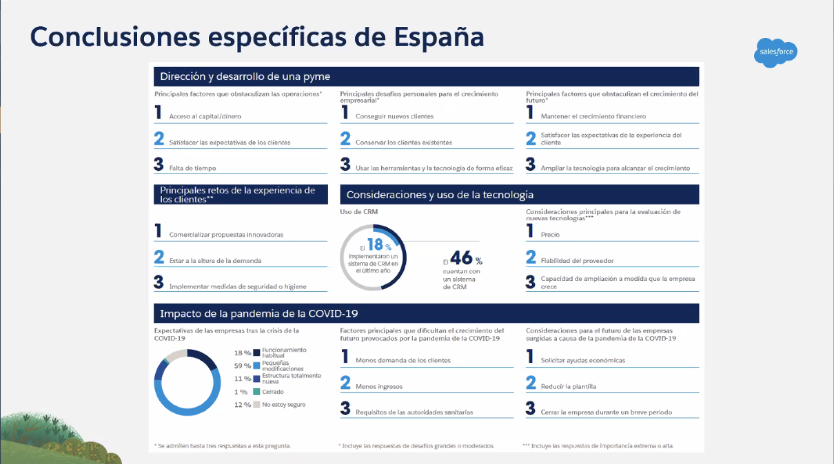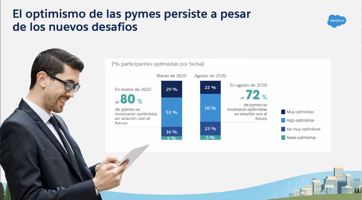 Salesforce ha presentado las principales conclusiones de la cuarta edición de su informe SMB Trends Report , que recoge la visión de las pymes ante el panorama actual y cómo hacen frente a los principales retos que tienen por delante, especialmente aquellos relacionados con la transformación digital. El estudio, en el que han participado más de 2.300 líderes de pequeños negocios de un total de 16 países (incluido España), se ha llevado a cabo en dos partes: una durante el pasado mes de marzo, y otra en agosto, en la que se han podido analizar los efectos de la pandemia y los desafíos que plantea.