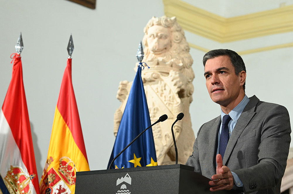 El jefe del Ejecutivo, acompañado por la presidenta del Gobierno de La Rioja, Concha Andreu, y la delegada del Gobierno en La Rioja, Beatriz Arraiz, ha hecho el anuncio de este nuevo organismo, enmarcado en el PERTE de la Nueva Economía de la Lengua.