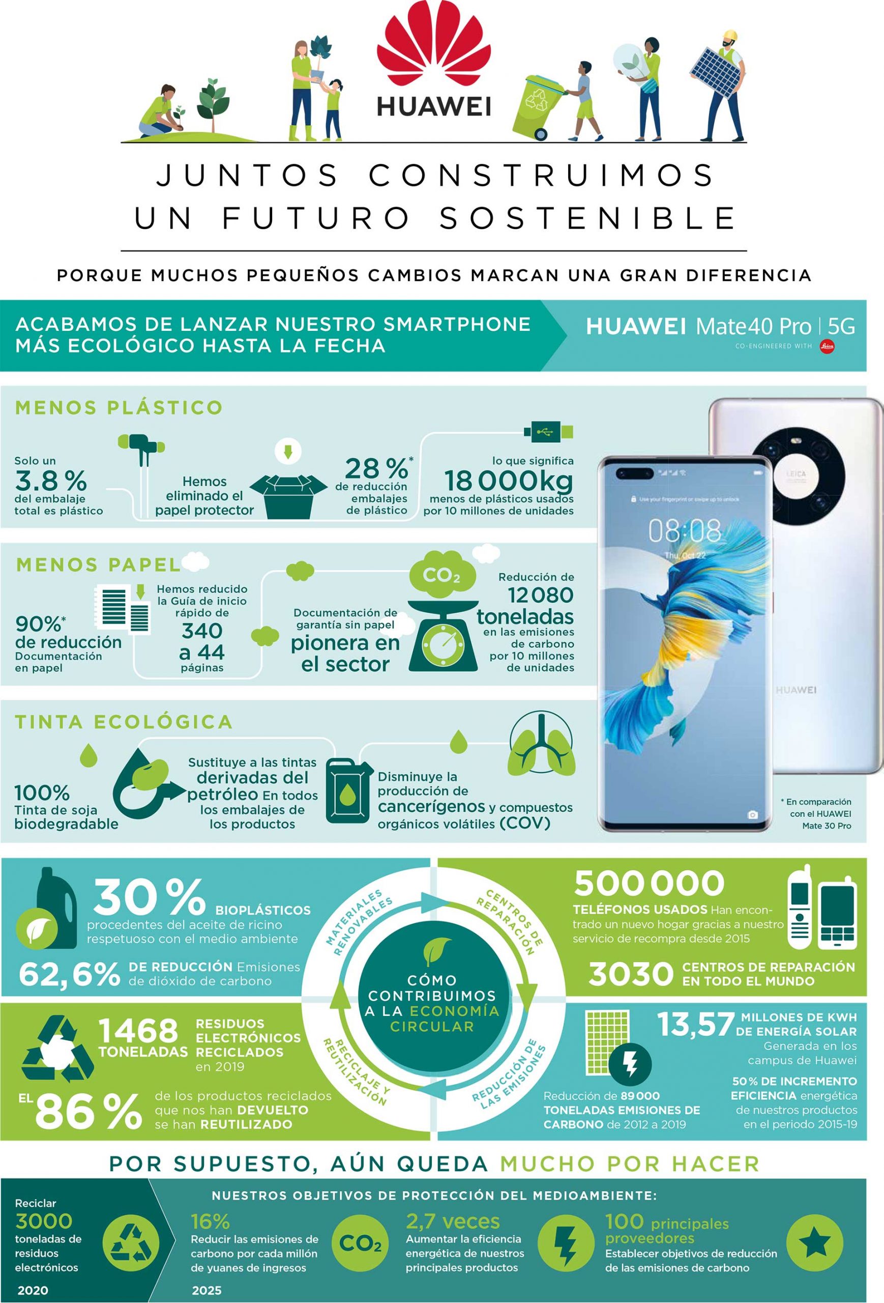 El recién lanzado HUAWEI Mate 40 Pro, trae consigo una reducción del 28% en cuanto al uso de plástico en el packaging y otra del 90% en relación a la documentación en papel, además de la sustitución de la garantía en papel por la electrónica. El consumo y la producción sostenibles consisten en hacer más y mejor con menos; en definitiva, se trata de desvincular el crecimiento económico de la degradación medioambiental, aumentar la eficiencia de recursos y promover estilos de vida sostenibles.