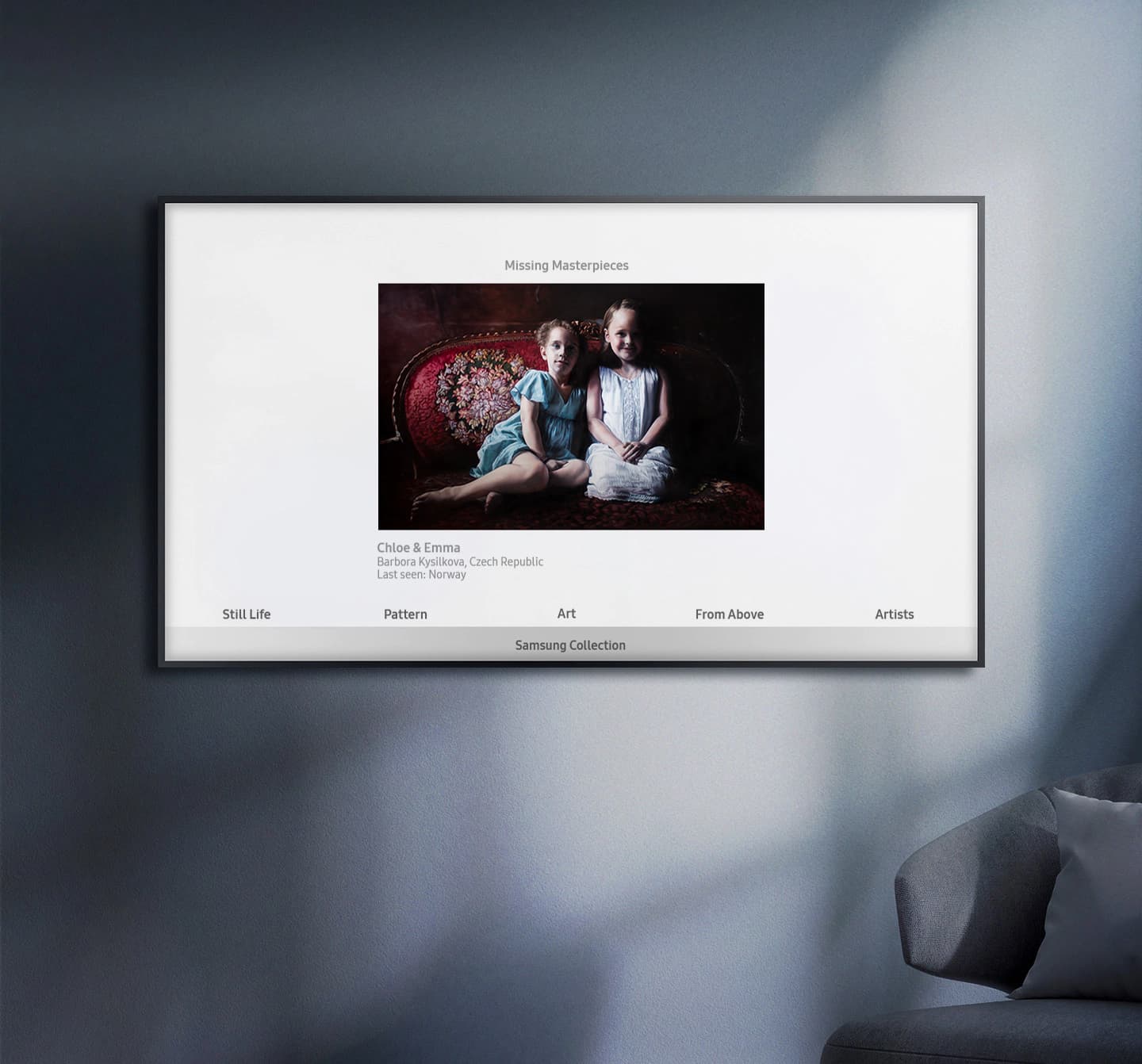 The Frame es diferente a cualquier otro televisor. Con su diseño único en forma de marco, funciona como una plataforma de arte multimedia, a la vez que se integra en la decoración del hogar cuando está apagado. Desde ese momento se activa Art Mode, transformando la pantalla en una galería con las colecciones de arte más significativas del mundo. Equipado con tecnología QLED, los colores de las obras de arte originales se muestran en alta definición. Las 12 obras de arte de la exposición Missing Masterpieces están disponibles para los usuarios de The Frame de forma gratuita en el catálogo de la Tienda de Arte.
