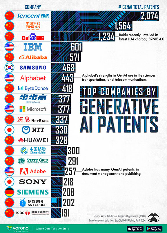 El mercado de la inteligencia artificial generativa (GenAI) sigue consolidándose como un sector estratégico a nivel global, con empresas tecnológicas compitiendo por desarrollar y proteger innovaciones en este campo. Un análisis reciente de datos de la Organización Mundial de la Propiedad Intelectual (WIPO) y EconSight revela las principales empresas por volumen de patentes relacionadas con GenAI, destacando una predominancia de actores chinos y estadounidenses.
