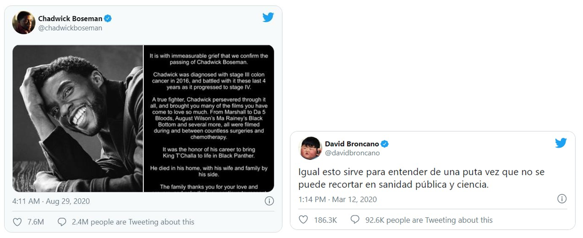 El mundo entero lloró la muerte del inolvidable Black Panther, Chadwick Boseman. El Tweet del anuncio de su fallecimiento se ha convertido en el más retuiteado del mundo y con más Me Gusta ❤️ de todos los tiempos. En España, el Tweet con más RT de 2020 es de David Broncano.