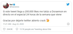 @IbaiLlanos protagoniza otro de los Tweets con más Me Gusta del año, prometió tatuarse a Doraemon en directo si llegaba a los 200.000 likes y… así fue.