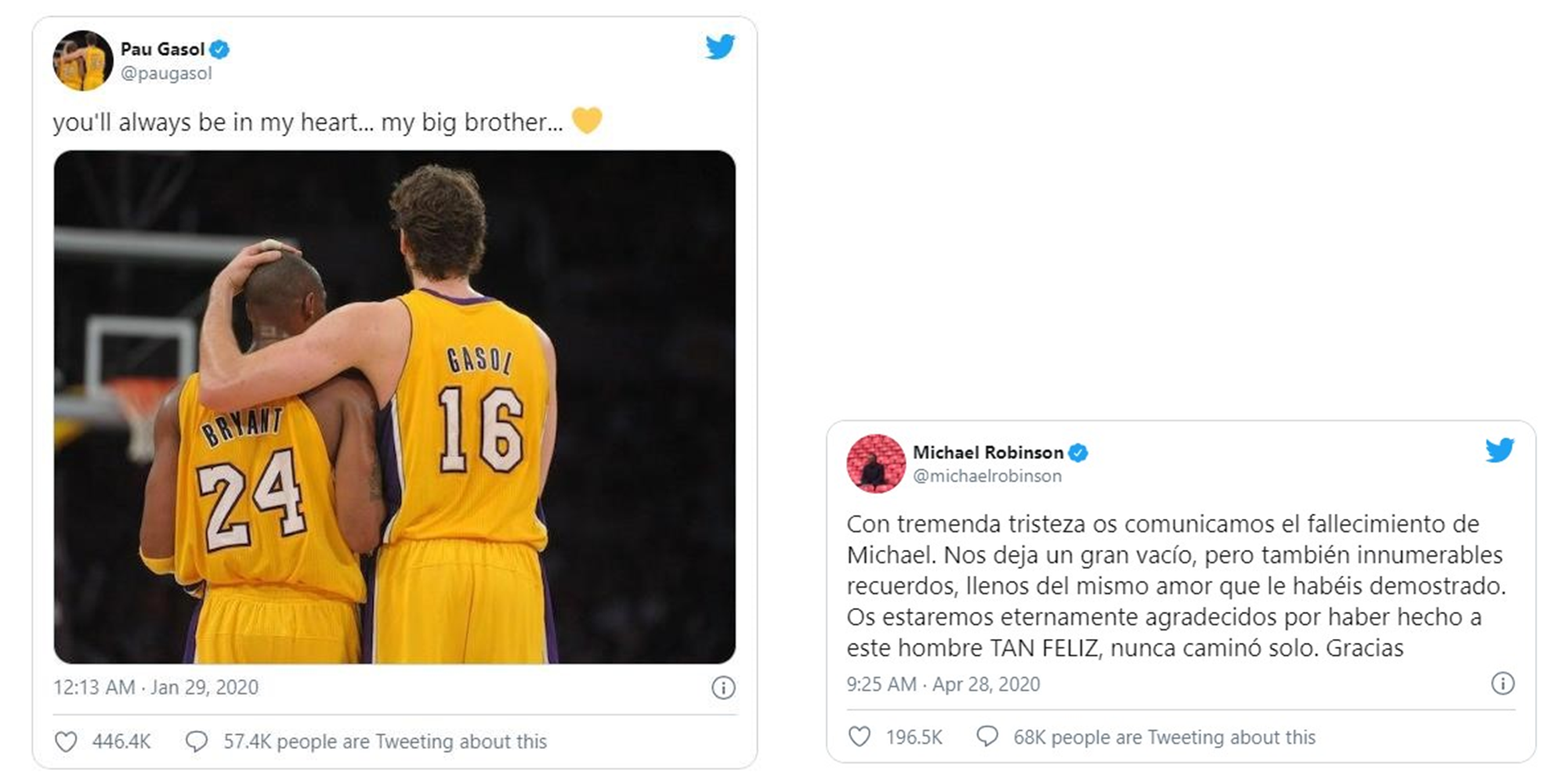 Un año de despedidas emotivas y gestos de cariño hacia aquellos que nos han dejado y que han sido protagonistas de la conversación. Ha sido el caso del accidente de @kobebryant al que Gasol hizo su particular homenaje; o Michael Robinson, futbolista, comentarista y presentador de televisión muy querido en España. Igualmente dijimos adiós al pintor y artista gráfico Juan Genovés, del que nunca olvidaremos su abrazo; y recientemente, a Maradona el ídolo al que el futbolista @RaulGonzalez despedía en con este Tweet.