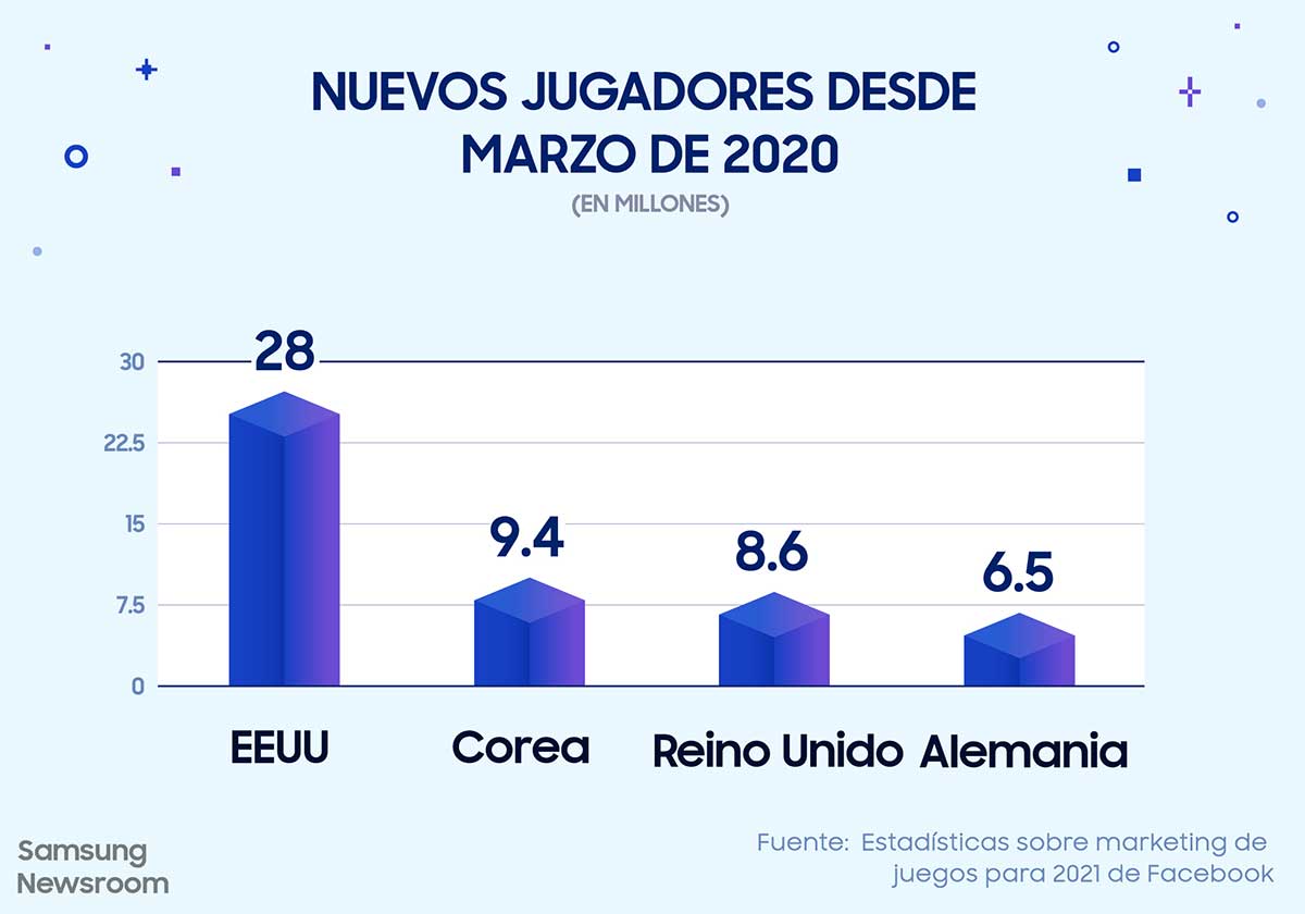 El aumento del consumo de videojuegos no se limita a Estados Unidos. El informe de Facebook “Games Marketing Insights for 2021” señala que, el año pasado, el número de nuevos jugadores alcanzó niveles máximos en países de todo el mundo, con 8,6 millones en el Reino Unido, 6,5 millones en Alemania y 9,4 millones en Corea del Sur. Estas cifras ponen de manifiesto que los videojuegos ya se han convertido en una de las principales actividades de ocio y entretenimiento a nivel global.