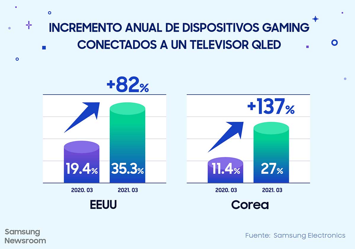 Los que tienen un televisor Samsung en casa han sacado todo el partido a su televisor al convertirse en jugadores durante la pandemia. Según los datos de la investigación interna de Samsung[, el número de usuarios en Estados Unidos que conectaron consolas o dispositivos similares a su televisor QLED casi se duplicó, pasando del 19,4% en marzo de 2020 al 35,3% en marzo de 2021. En Corea, esa cifra casi se triplicó, pasando del 11,4% al 27% durante el mismo periodo.