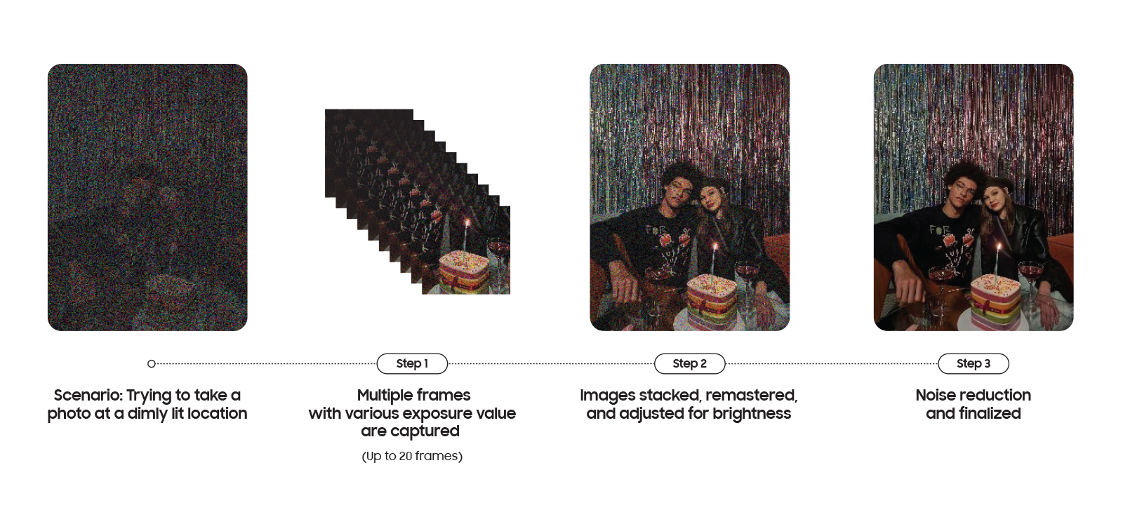 Tanto si intentas hacer una foto de un bonito paisaje urbano de noche como un selfie de grupo en un restaurante con poca luz, desde el momento en que pulsas el obturador, la IA de la cámara de la serie Galaxy S21 inicia un proceso de tres fases. Así es como funciona: