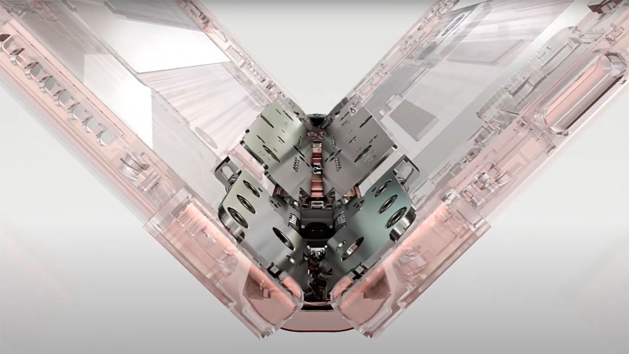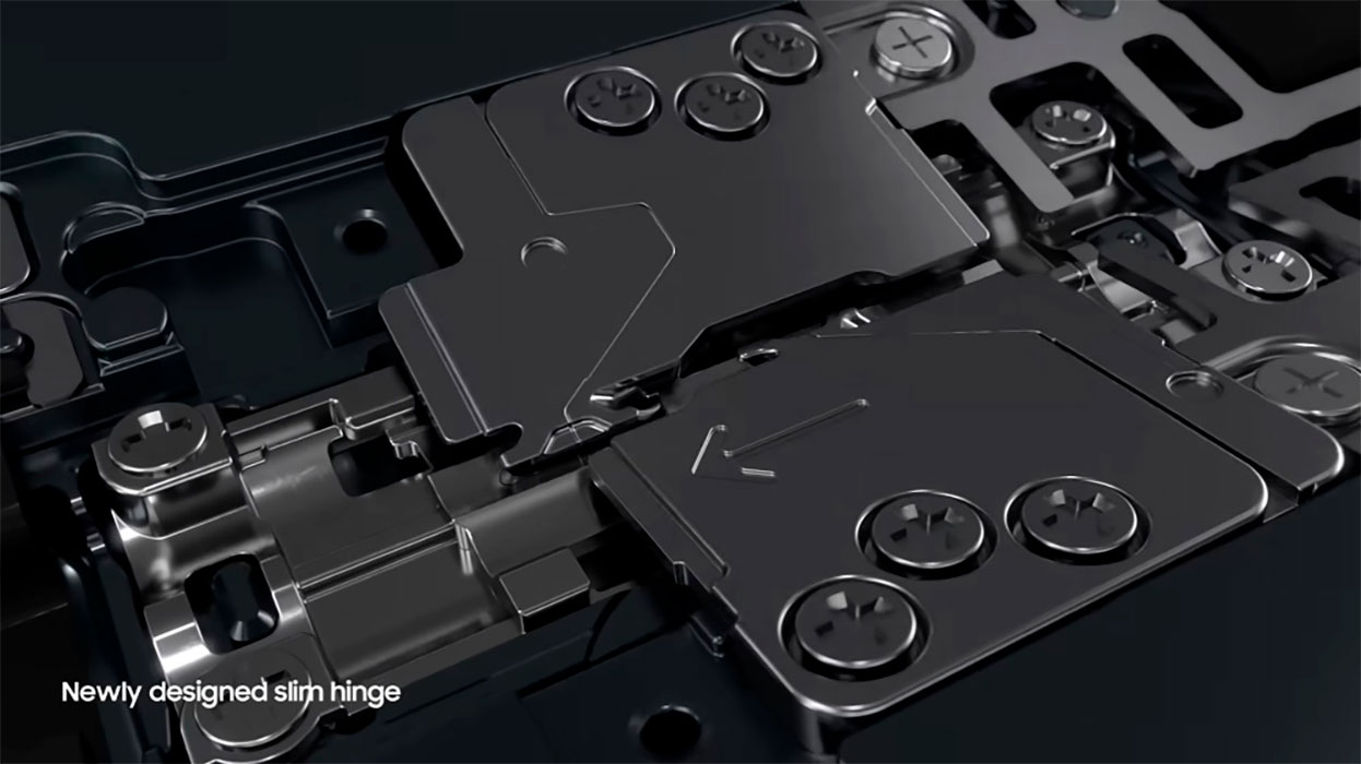 Las más de sesenta piezas de la bisagra Hideaway hicieron realidad el innovador mecanismo CAM dual. La superficie plana entre dos piezas en forma de cresta, CAM, ayudaba a mantener el dispositivo abierto o cerrado y permitía el modo Flex. Al aumentar el número de estructuras CAM y muelles, la bisagra podía soportar ángulos más amplios de forma fiable. La bisagra Hideaway se montó en una ubicación óptima en el Galaxy Z Fold2 para conseguir un diseño aún más delgado y un grosor máximo plegado de solo 16,8 milímetros.